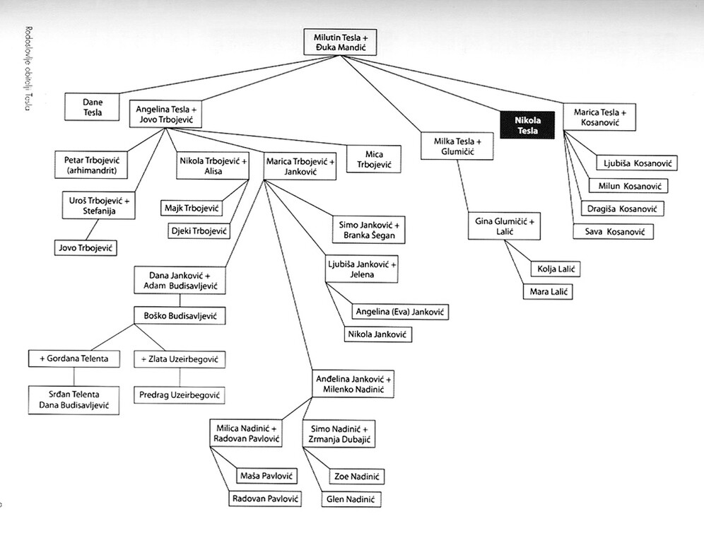 Nikola Tesla rodio se 10. srpnja 1856. godine u Smiljanu-Lika kao četvrto dijete pravoslavnog svećenika Milutina i njegove supruge Georgine (Đuke) rođene Mandić. Obitelj Tesla imala je petoro djece: Milku (udatu Glumičić), Angelinu (udatu Trbojević), Danila, Nikolu i Mariju-Maricu (udanu Kosanović). Nikola Tesla je umro 7. siječnja 1943. godine u hotelu New Yorker u sobi 3327. Urna Nikole Tesle se nalazi u muzeju Nikola Tesla u Beogradu. Većinu dokumenata i Teslinih osobnih stvari prenio je Teslin nećak Kosanović u muzej u Beograd.